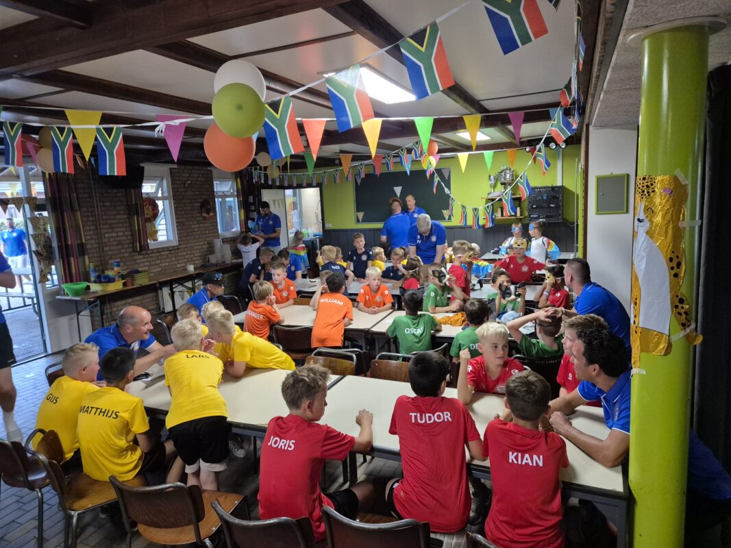 Eenmaal aangekomen op de locatie was het snel tassen dumpen en hup – meteen door naar de eerste activiteiten. De jongste groep dook gelijk het bos in voor een actief spel, terwijl de midden- en oudste groepen zich op het veld vermaakten met voetvolley en eilandvoetbal. Heerlijk om iedereen zo fanatiek bezig te zien!