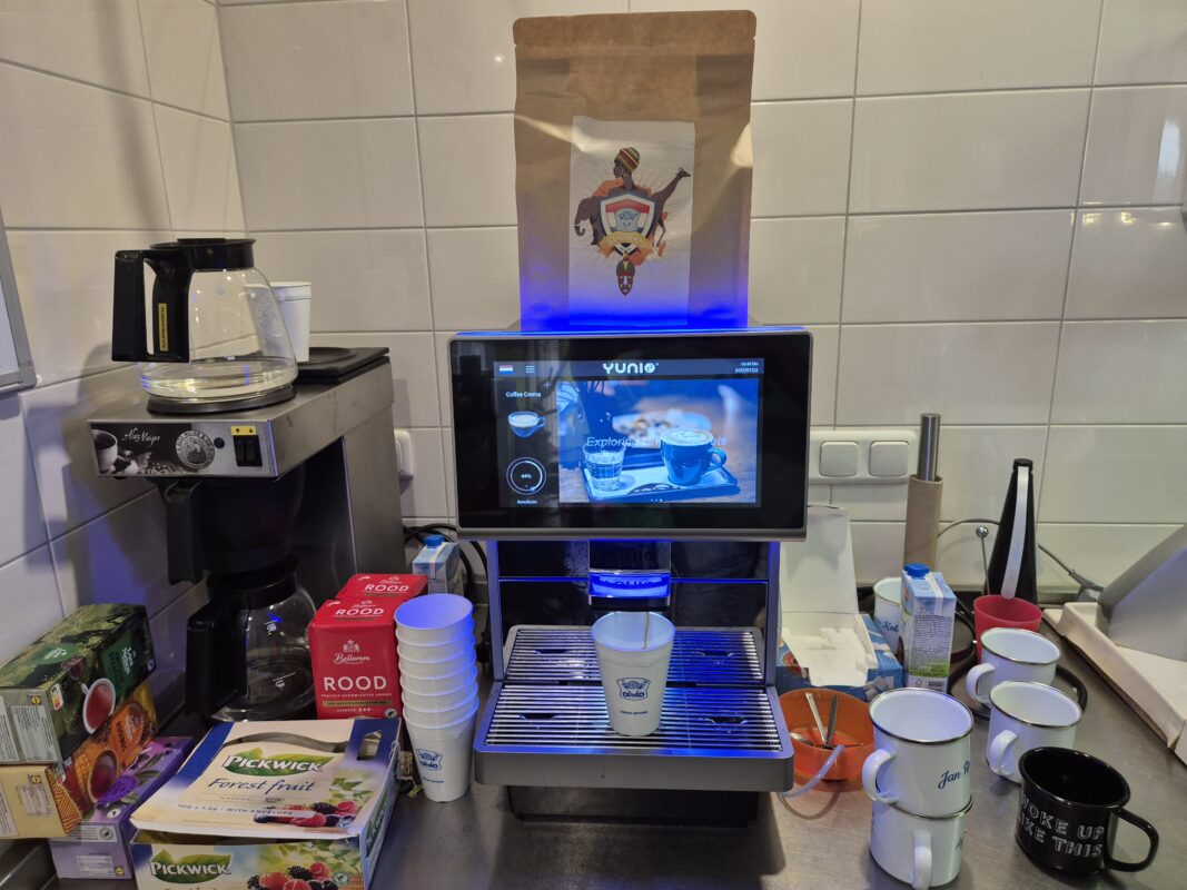 De ochtenden worden langzaam wat zwaarder: kinderen én leiding kruipen steeds wat later en rustiger hun bed uit. Gelukkig is daar de redding in de vorm van koffie: met dank aan meersmaak.nl voor het leveren van bonen en de koffiemachine!