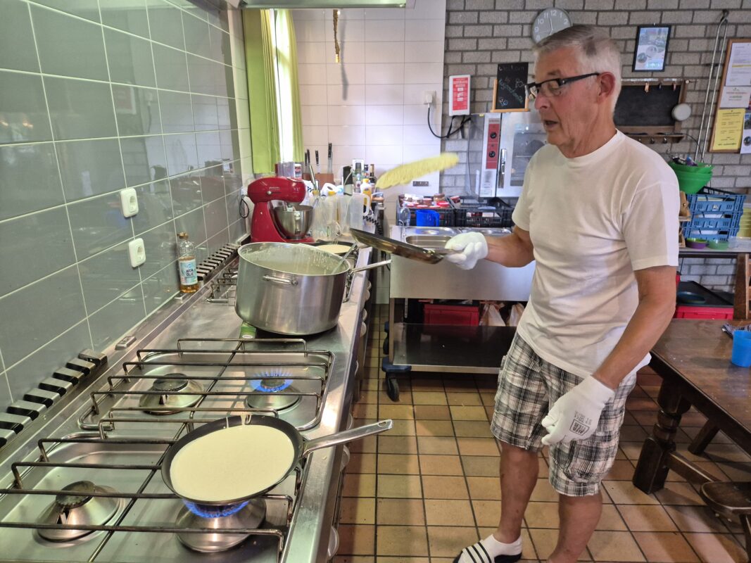 Ondertussen draaide het kamp op de achtergrond gewoon door. De keukenploeg begon alvast aan een flinke klus: het smeren van broodjes voor de lunch (die in het zwembad werd afgeleverd, zodat we extra lang konden zwemmen) én… het bakken van ongeveer 600 pannenkoeken. Respect!
